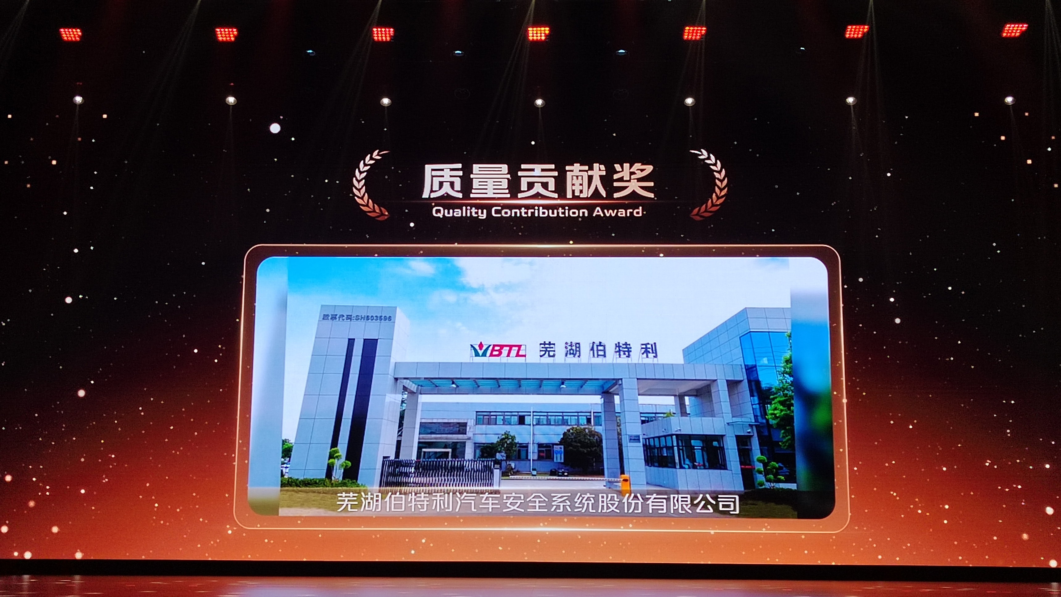 2023年1月12日,以“攜手勇進 一路有你”為主題的2023長安汽車全球伙伴大會在重慶大劇院舉行。作為長安汽車安全系統領域的重要供應商,伯特利從數百家零部件供應商中脫穎而出,榮獲長安汽車2022年度“質量貢獻獎”,充分體現了長安汽車對伯特利產品質量與服務的高度認可。伯特利總經理顏士富先生參加大會并接受榮耀獎牌。